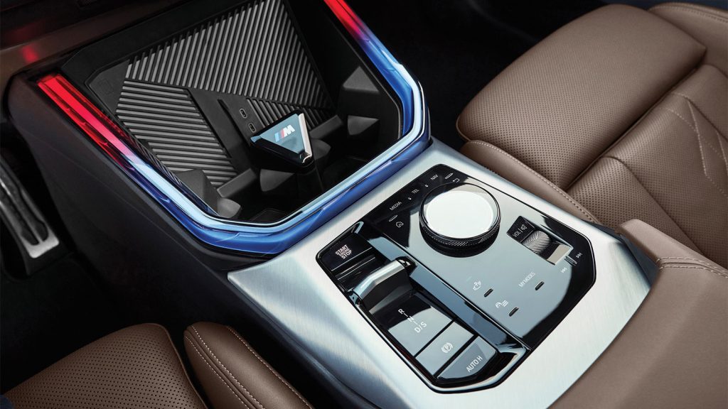 W środku BMW gra w dwie gry naraz. Z jednej strony jest nowoczesne „wow”: zakrzywiony zestaw ekranów pod jedną taflą szkła, geometryczna architektura deski i ambient, który nocą potrafi zmienić kabinę w scenografię do filmu science fiction – takiego, w którym bohater jedzie na spotkanie z własnym przeznaczeniem, a nie po bułki. Mój egzemplarz robił sporo, żebym miał mu wybaczyć wszystko. Skóra BMW Individual Merino Black/Atlas Grey, deska rozdzielcza Luxury, szczotkowane aluminium, podsufitka M Anthracite, pasy z przeszyciami w barwach BMW M, sportowe fotele z wentylacją i ogrzewaniem, do tego panorama nad głową – to wszystko buduje atmosferę, w której łatwo wpaść w myślenie: „okej, tu jest klasa”. Pozycja za kierownicą też jest klasycznie bmw-owska: siedzisz pewnie, masz poczucie kontroli i tego, że kabina została narysowana z myślą o kierowcy.