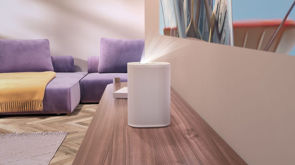 Na pierwszy rzut oka The Premiere 5 przypomina raczej inteligentny głośnik niż projektor. Niewielka, zaledwie 20-centymetrowa, biała kolumna owinięta wentylacyjną siatką wygląda jak elegancka maskownica audio. Dzięki gumowym nóżkom projektor stoi stabilnie i nie ślizga się na żadnej powierzchni. Producent dodał również gniazdo statywowe, więc urządzenie można ustawić praktycznie wszędzie – nie trzeba ograniczać się do biurka czy półki pod ścianą. Z góry widać czujnik odległości, obiektyw i panel dotykowy z diodami sygnalizacyjnymi.